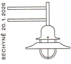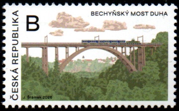most Duha se siluetou města Bechyně v pozadí. Přes most projíždí elektrická lokomotiva řady 113 s připojenými osobními vozy typu Btn. Autor vybral motiv, ze kterého je na první pohled patrný jak samotný most jako významný urbanistický prvek v panoramatu města, tak i původ jeho názvu Duha.