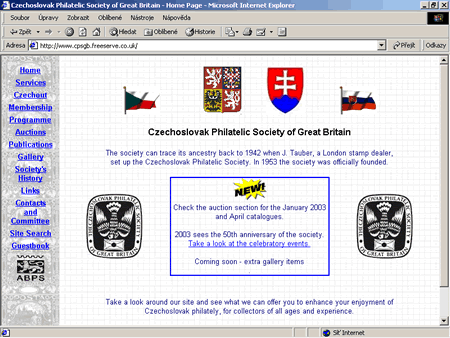 Společnost Czechoslovak Philatelic Society of Great Britain sídlící tedy ve Velké Británii má své vlastní internetové stránky, které se nacházejí na www.cpsgb.freeserve.co.uk. Autoři jsou velkými přáteli československé filatelie. Je to velice významná společnost zabývající se známkami ČSR a věřím, že jestliže zvládáte angličtinu, stránky Vás zaujmou.