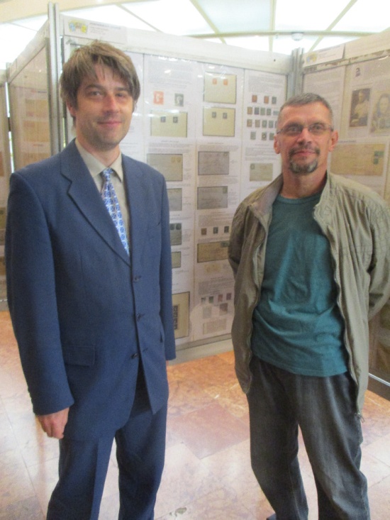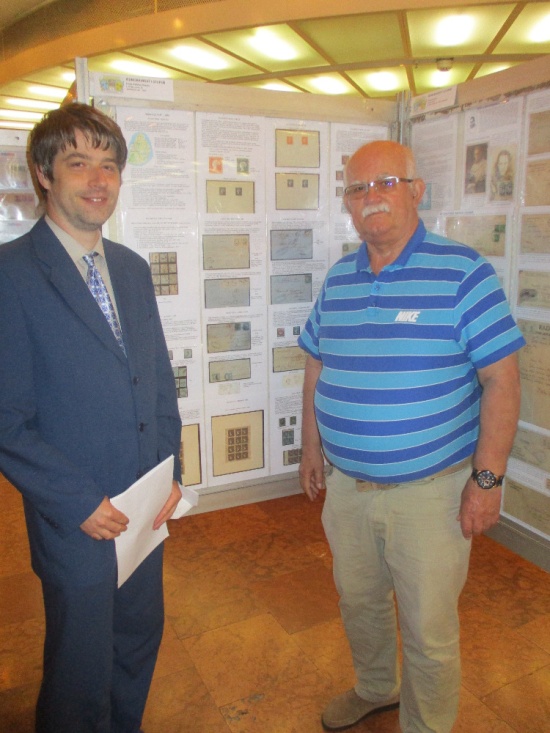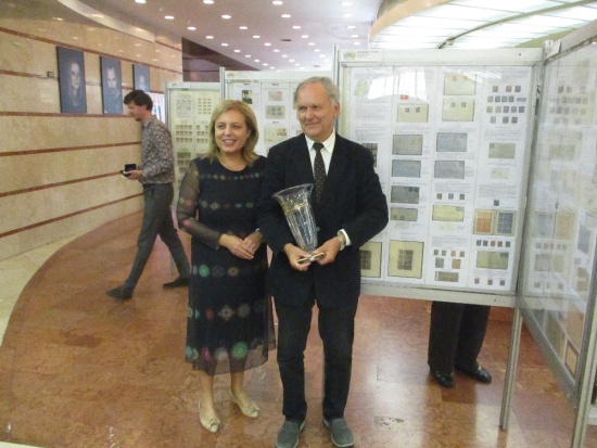 PhDr. Irena Kyrinovičová s Jaromírem Petříkem před jeho vítězným exponátem (Cenu ministra MDV SR předala PhDr. Irena Kyrinovičová, generální ředitelka odboru elektronických komunikací a poštovních služeb MDV SR, nejúspěšnějšímu vystavovateli Jaromírovi Petříkovi z České republiky za exponát „MAURITIUS 1847-1859“).