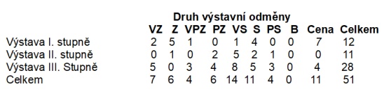 Číslo exponátu – vystavovatel – název exponátu – hodnocení (medaile) – počet bodů