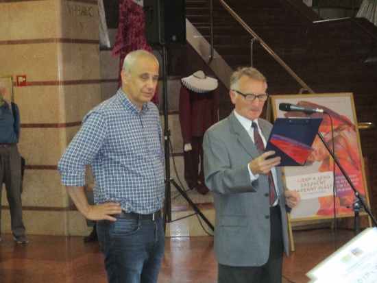Jaromír Petřík přebírá hlavní cenu výstavy z rukou předsedy organizačního výboru Milana Šajgalíka
