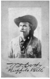 William Frederic Cody alias Buffalo Bill ve svém oblíbeném artistickém kostýmu, loveckém úboru se širákem na hlavě. Mimochodem: Byl zároveň i neoficiálním agentem Winchestrových závodů a proto na svých vystoupeních střílel zásadně jen z Winchestrovy opakovačky, vzor 1873.