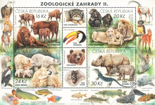 Na čtyřech kuponech a okrajích aršíku jsou vyobrazeny další vzácné druhy zvířat našich předních zoologických zahrad.