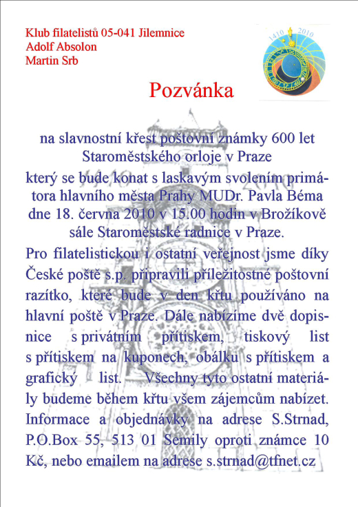 Pozvánka na slavnostní křest poštovní známky 600 let Staroměstského orloje v Praze