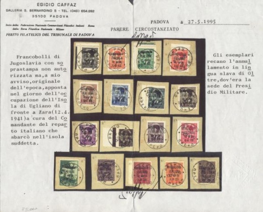 Keď talianske vojsko v tzv. Aprílovej vojne obsadilo 12. apríla 1941 juhoslovanský (dnes chorvátsky) ostrov Uglian, ležiaci naproti Zadaru, dal veliteľ výsadku pretlačiť ukoristené juhoslovanské známky. Na obrázku je 19 z 25 nominálov pretlačených známok, použitých v meste Preko 13. apríla 1941.