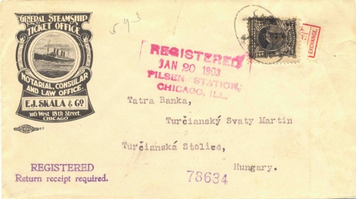 V mých celistvostech se vztahem k námořní dopravě jsem objevil přiloženou obálku z amerického Chicaga adresovanou do Tatra Banky na Slovensku (konkrétně do pobočky Turčiansky Sv.Martin, dnes Martin). Odesílatelem je agentůra zajišťující lodní lístky pro vystěhovalce.