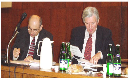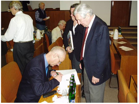 Na této fotografii byl zachycen M.Langhammer při podpisu své knihy nově zvolenému předsedovi. Dalším zájemcem o autogram je Zdeněk Okáč.